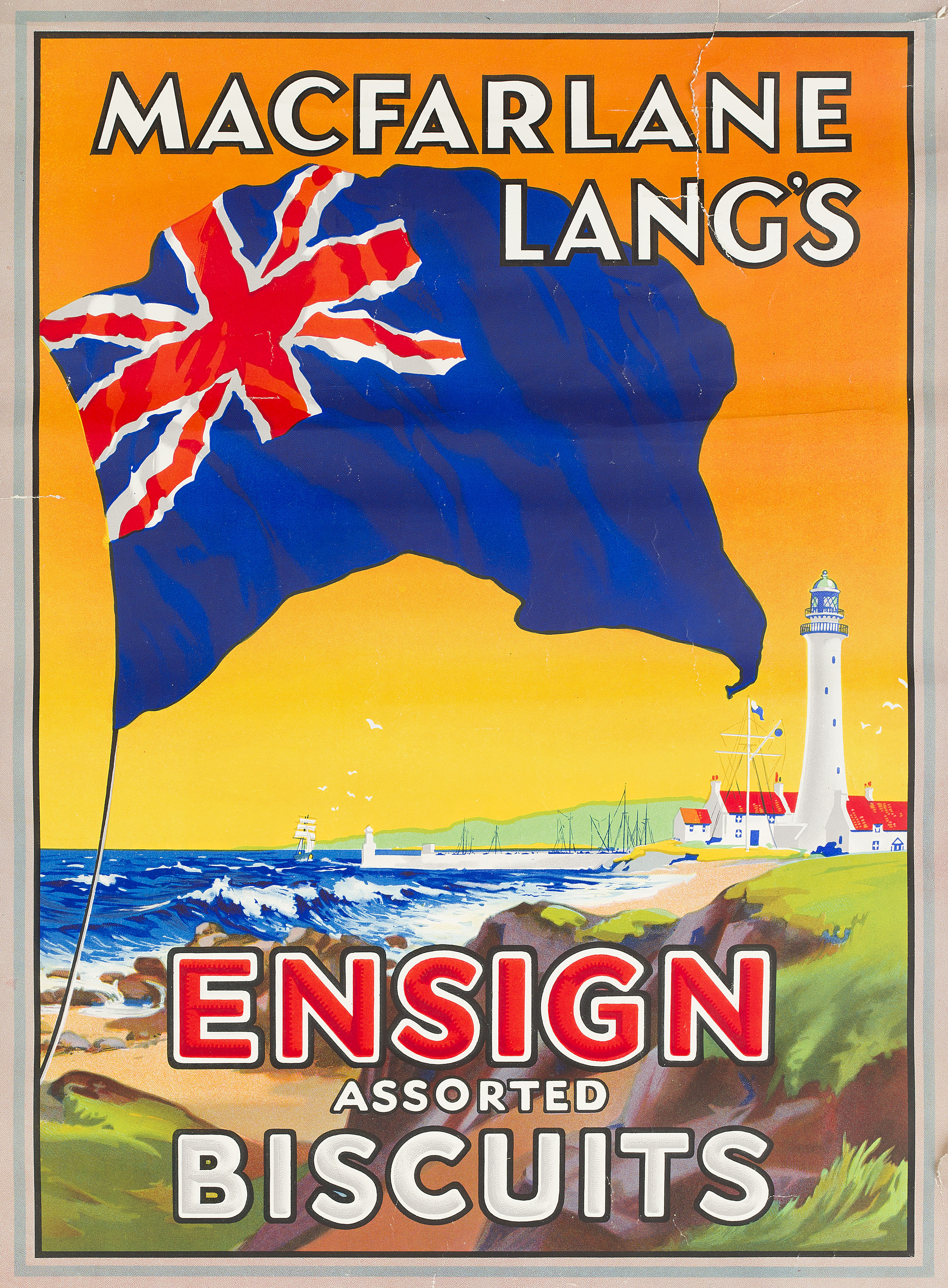 including MACFARLANE LANG'S ENSIGN ASSORTED BISCUITS, 48.5cm x 36.6cm; MACFARLANE LANG'S SCOTCH SHORTBREAD, 45.3cm x 30.6cm; MACFARLANE LANG'S CHOCOLATE BISCUITS, 53.3cm x 39cm; DEXTER WEATHERPROOFS, 28.5cm x 58.5cm; ORANGE MARMALADE, 49.9cm x 36.7cm; TRYST LIPSTICK, 75cm x 49cm; HENDAWICK UNDERWEAR, 46.7cm x 34cm, etc (11)