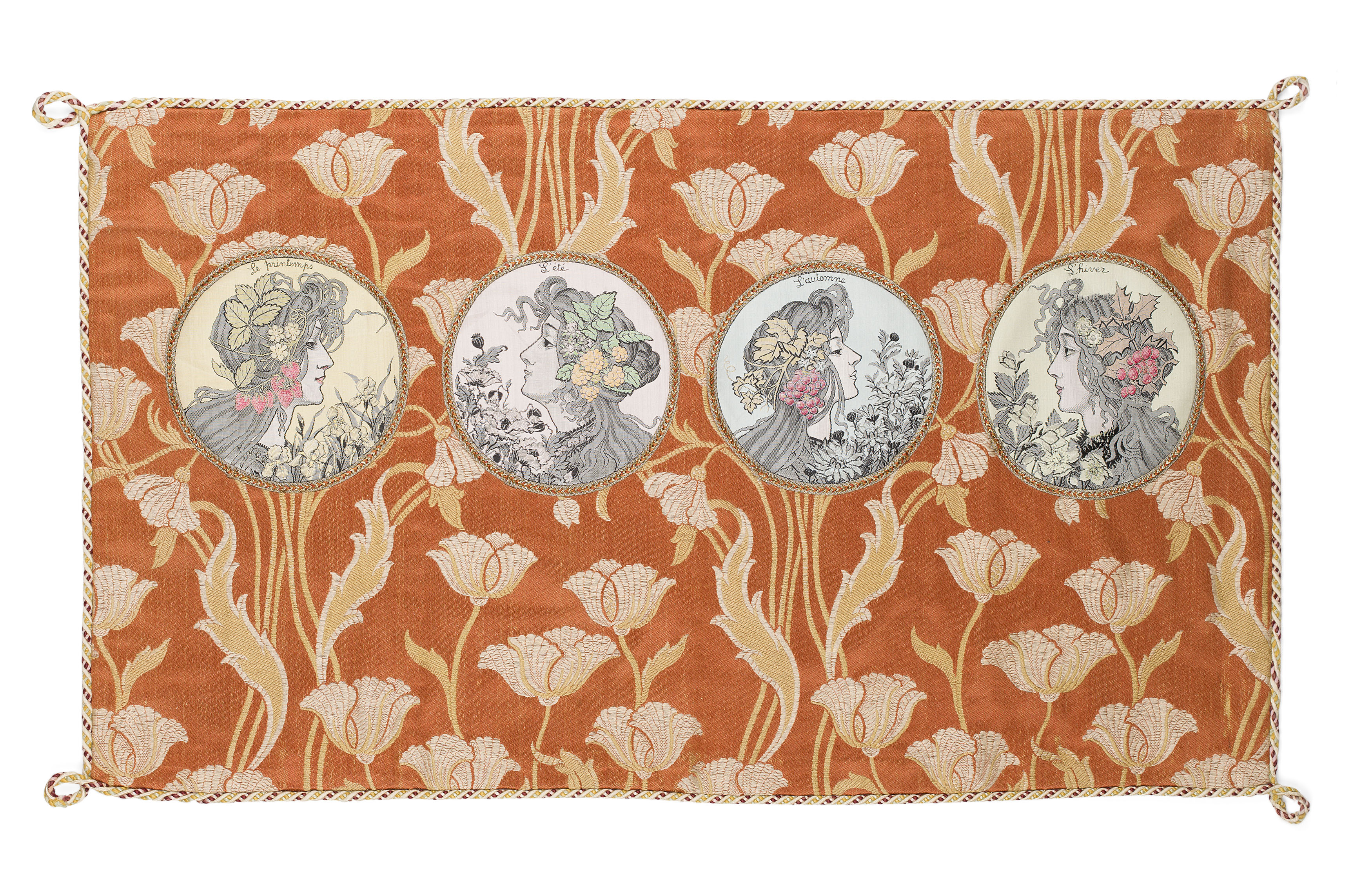 with repeating poppy design, appliqued with four roundels, each woven with allegories of the seasons after designs by ALPHONSE MUCHA, within braided border