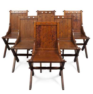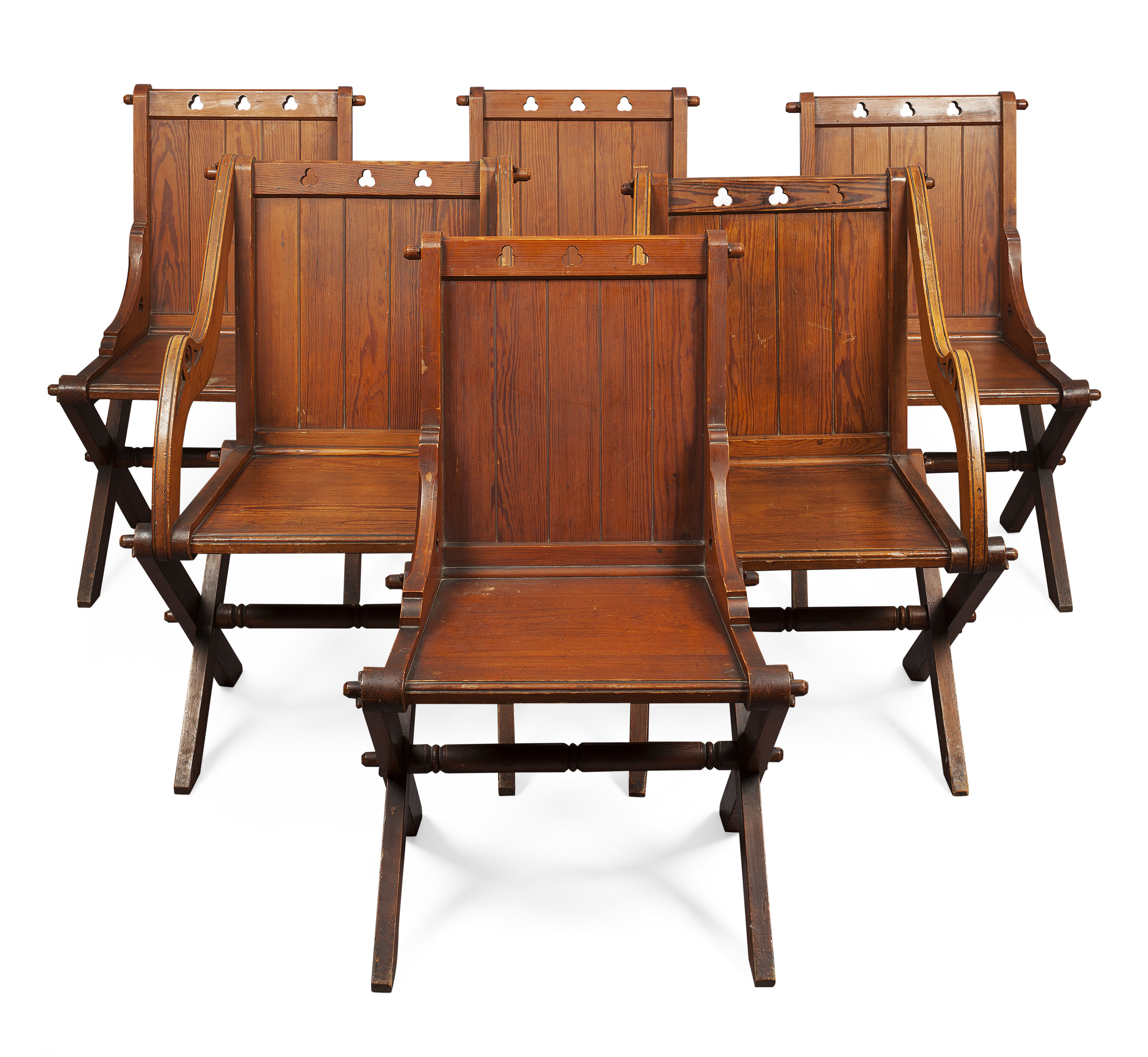 MATCHED SET OF 12 GOTHIC REVIVAL PITCH PINE DINING CHAIRS, CIRCA 1880