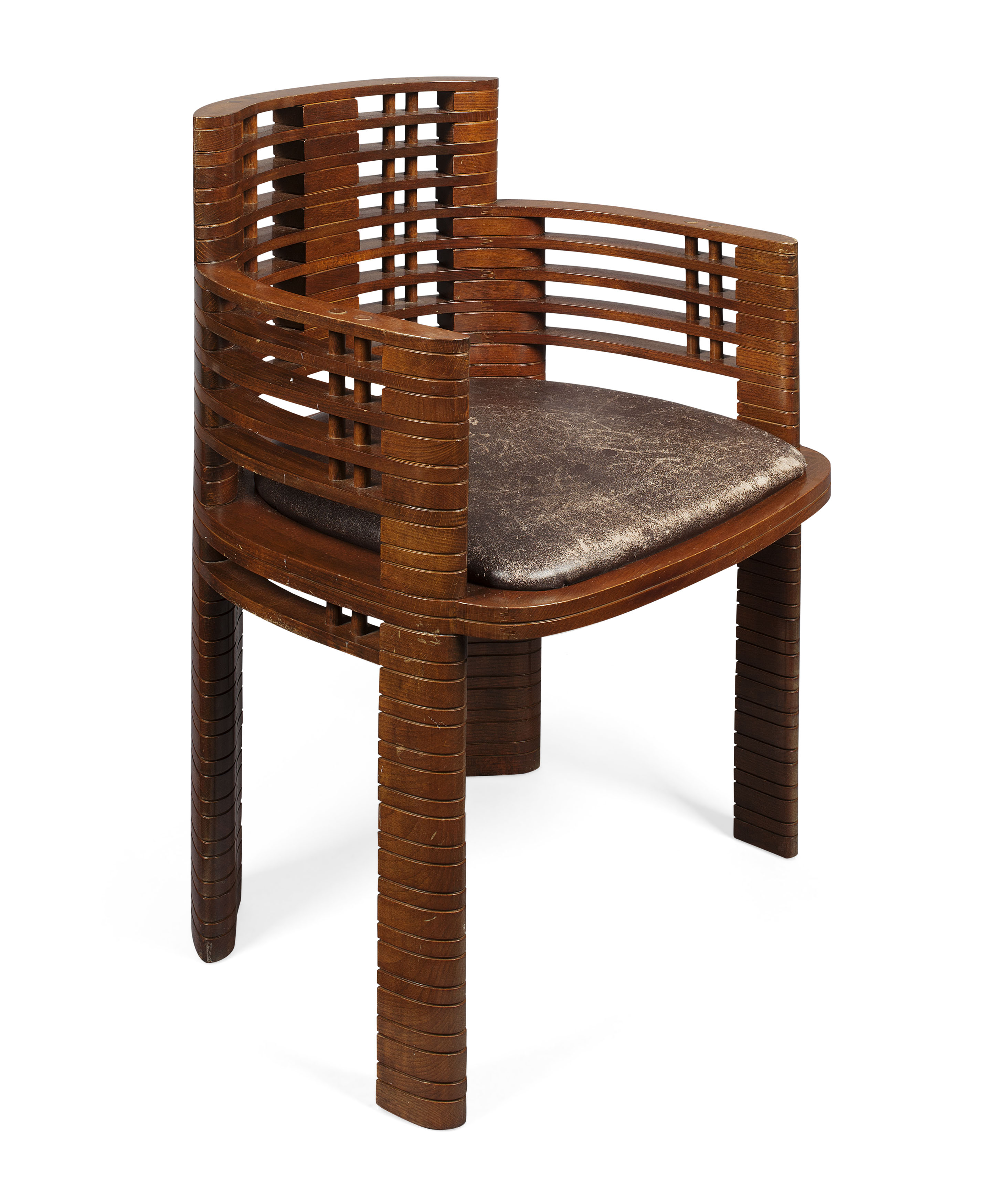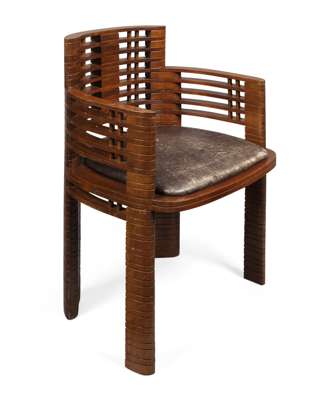 of tub form with curved back and arms formed of horizontal slats with spacers, the drop in seat raised on corresponding legs