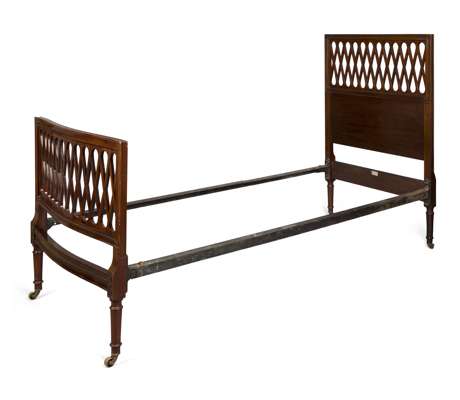 each with carved lattice panels to the head and foot boards, raised on turned legs, iron rails, each bears ivorine maker's labels (2)