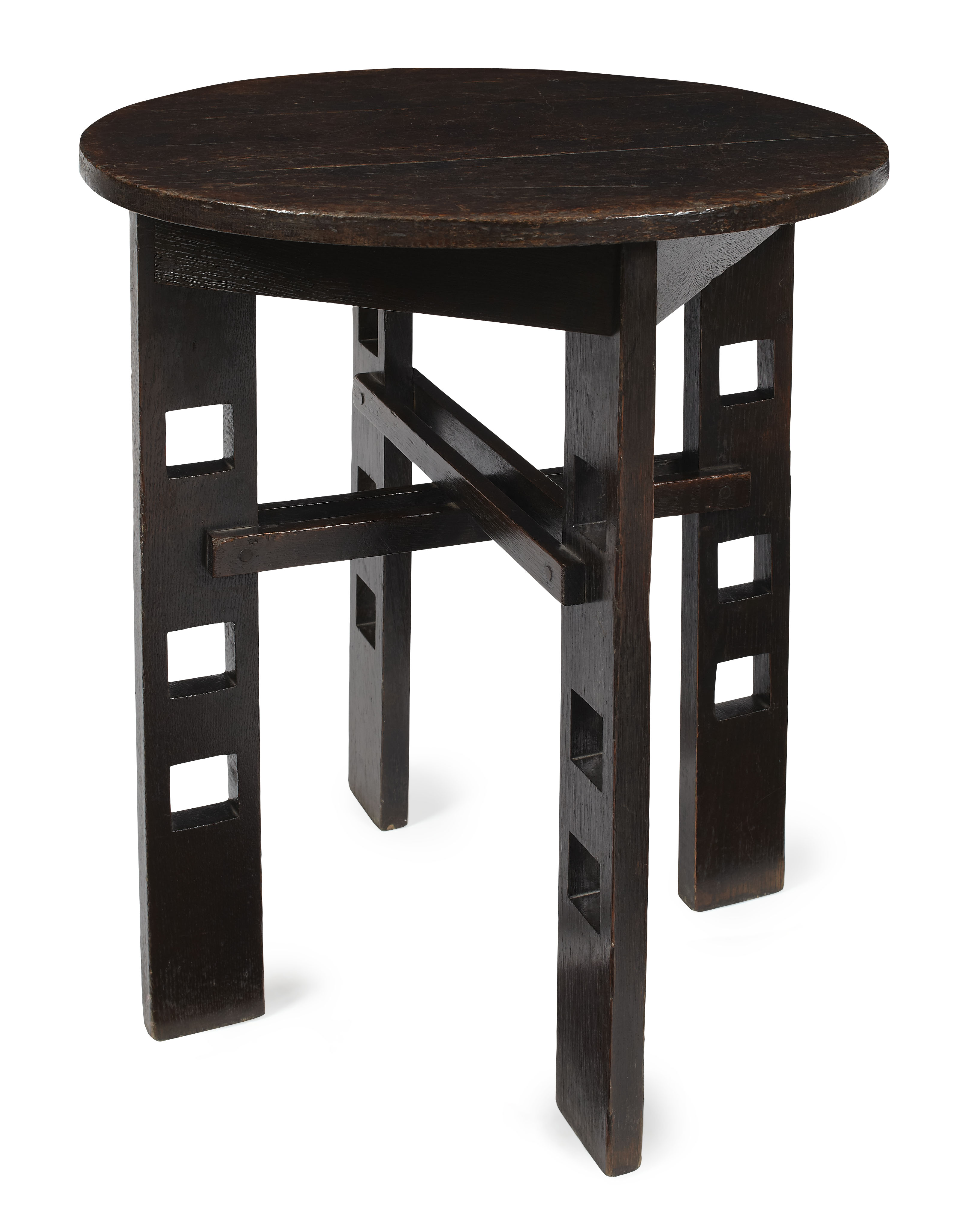 the circular planked top, raised above a plain frieze and four plank supports, pierced with squares and linked by double crossed stretchers