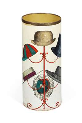 brass, lacquered and lithographic transfer of hats on a stand over board, printed marks FORNASETTI/ MILANO/ MADE IN ITALY