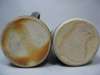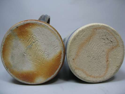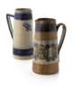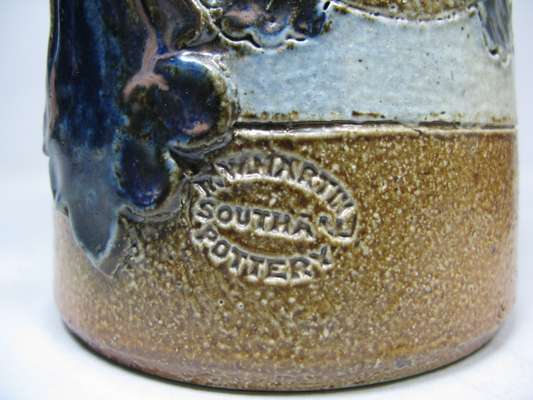 each of tapering cylindrical form with salt glaze, one with ribbed bands and flying bird motif in blue on a buff ground, incised marks R.W. MARTIN/ SOUTHALL, 23.2cm high; the other with band of foliate motifs, incised marks R.W. MARTIN/ SOUTHALL, impressed marks to body R.W.MARTIN/ POTTERY/ SOUTHALL, 22cm high (2)