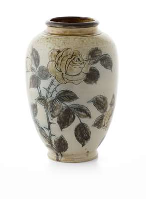 of shouldered tapering form, incised and painted with flowering roses, incised marks R.W. MARTIN & BROS/ LONDON & SOUTHALL/ 5-1886