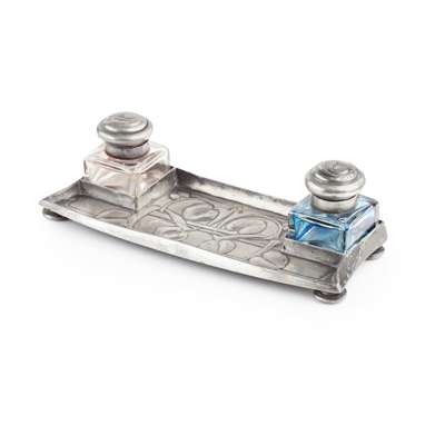 'TUDRIC' PEWTER AND GLASS INKWELL, CIRCA 1905