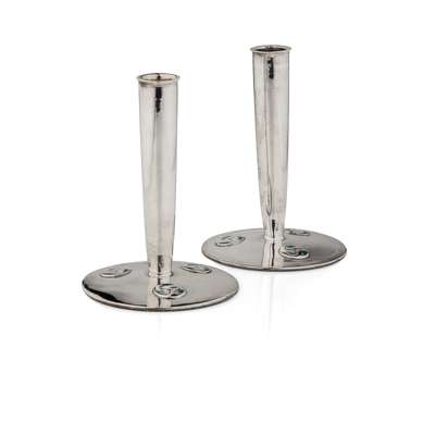 PAIR OF 'CYMRIC' SILVER AND ENAMEL CANDLESTICKS, 1906