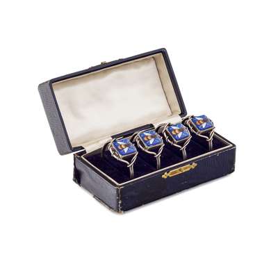 FOUR WHITE METAL AND ENAMEL NAPKIN RINGS, EARLY 20TH CENTURY