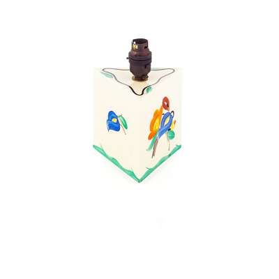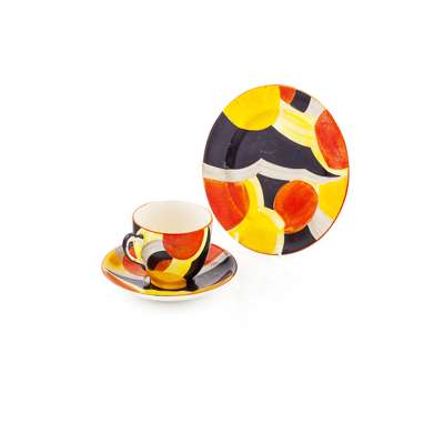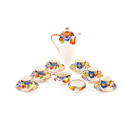each piece decorated with flowers in enamels, with printed maker's marks, comprising of: a COFFEE POT AND COVER; a SUGAR BOWL; a MILK JUG; SIX COFFEE CUPS; and SIX SAUCERS; together with SUSIE COOPER FOR GRAYS POTTERY, HANLEY, TWO TEA TRIOS, in coloured enamels, with printed maker's marks, each comprising of: a TEA CUP; a SAUCER; and a SIDE PLATE; and a SUSIE COOPER PRODUCTION CROWN WORKS, BURSLEM, LAMP BASE, of triangular form, decorated with flowers in enamels, with printed maker's marks; and a DOULTON LAMBETH STONEWARE DISH, decorated by Mark Marshall, 16cm diameter (qty)