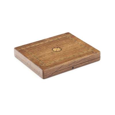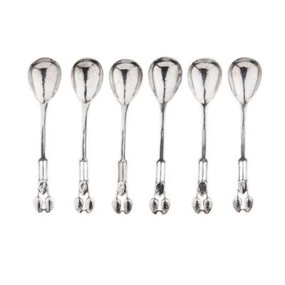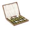 each with a hammered bowl and plain stem, the terminal cast as three stylised leaves, with maker's mark A. E. J., hallmarked Birmingham 1914, in original inlaid oak box