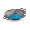 of oval form, with twin handles and pierced clover leaf rims flanking a central enamel well, stamped marks MADE IN ENGLAND/ ENGLISH PEWTER/ 0287