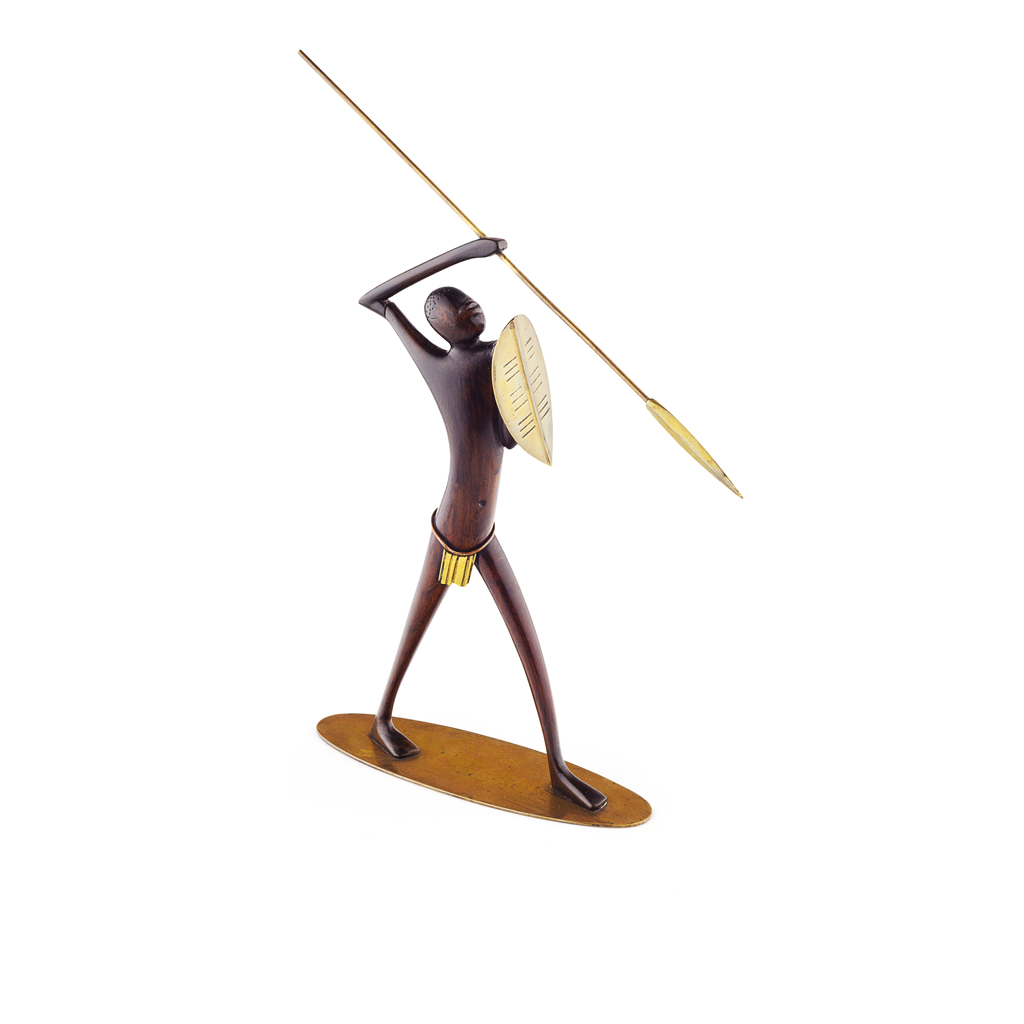 carved as a tribal figure with a brass and copper modesty pouch, clutching a brass shield and spear, on a brass oval base, stamped mark