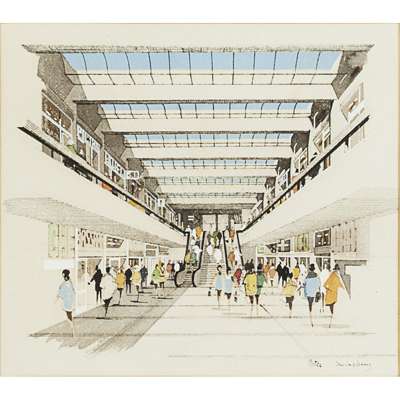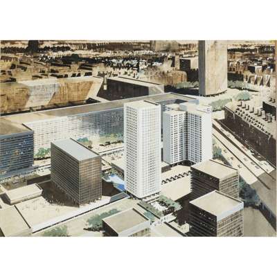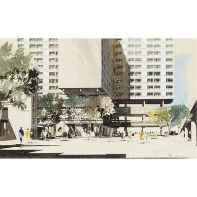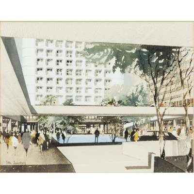 watercolour and gouache, signed PETER SAINSBURY, 39cm x 54cm and THREE OTHER ARCHITECURAL LANDSCAPES, by the same hand 23cm x 25cm; 23cm x 28cm and 25cm x 39cm (4)