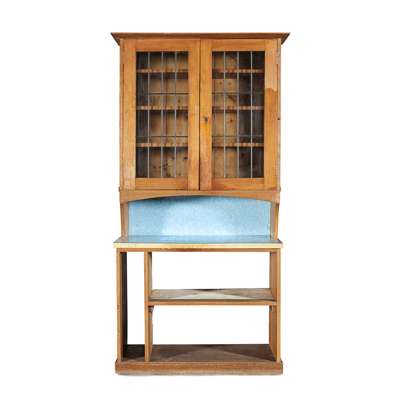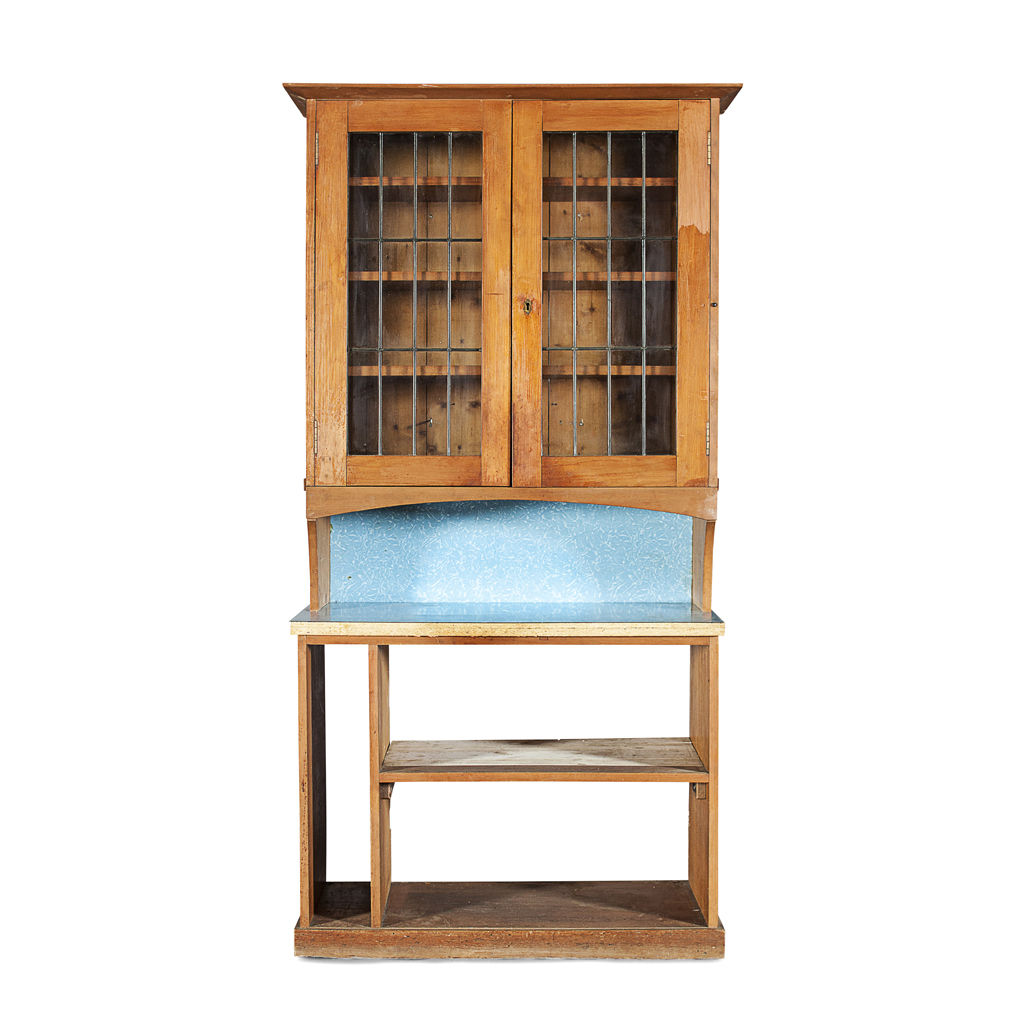 the projecting cornice above two doors with glazed and leaded panels, above and arched apron with later Formica splashback, the later rectangular top above an asymmetric arrangement of open shelves, the whole raised on a plinth