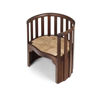 the curved top rail and slat-filled bac and arms, extending to the base, linked by a stretcher and with facetted infilled panels, enclosing a drop-in rush seat