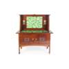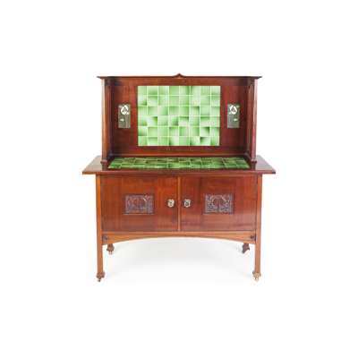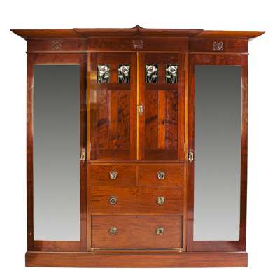 comprising a WARDROBE, with projecting cornice and frieze carved with roses, above two doors with leaded glass panels, flanked by mirrored doors on a plinth, 215cm wide, 223cm high, 67cm deep; a DRESSING TABLE, with corresponding decoration (mirror lacking), 138cm wide, 149cm high, 57cm deep; a WASHSTAND, inset with green tiles, 123cm wide, 139cm high, 57cm deep; and a BEDSIDE CABINET, with single drawer, 40cm wide, 94cm high and a TOWEL RAIL (disassembled, rails lacking) (4)