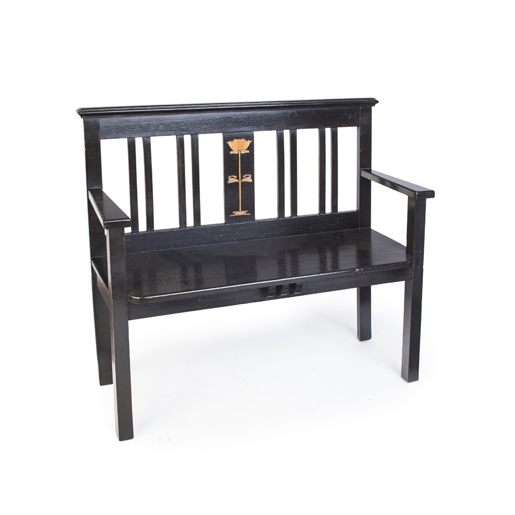 STAINED OAK AND INLAID HALL SETTLE, CIRCA 1900