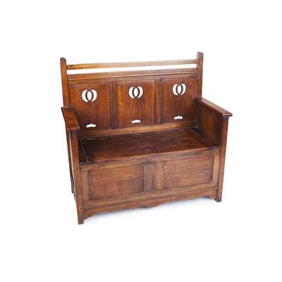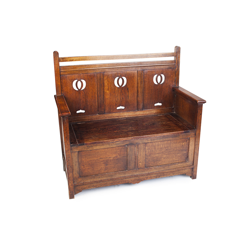 the panelled back pierced with plant forms, above open arms and hinged seat, bears label JOHN WATSON LTD., SHEFFIELD
