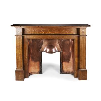 with riveted copper insert, the broad mantel above marquetry inlaid Dutch figures, and fluted jambs