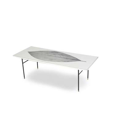 the rectangular laminated top with printed leaf design, raised on turned ebonised legs