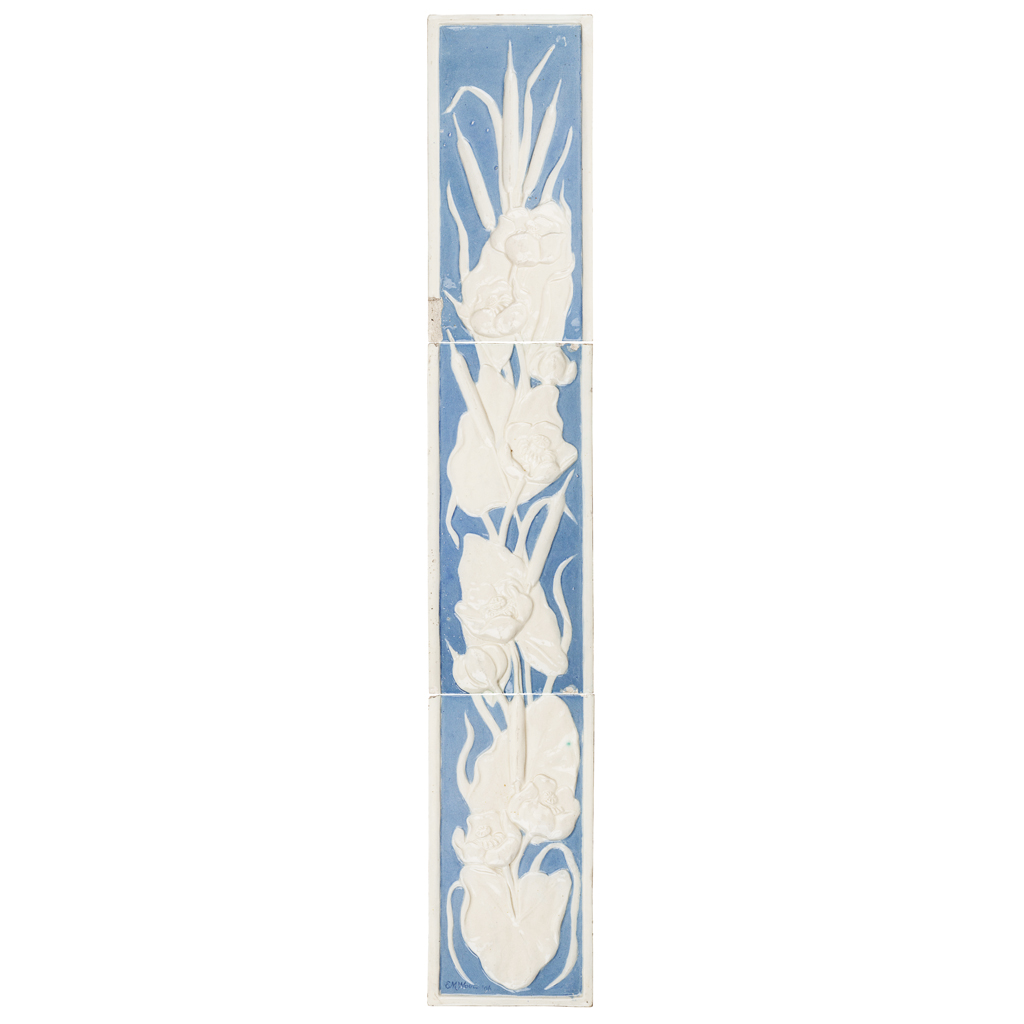 modelled in relied with waterlilies and bulrushes in blue and white, incised to the lower panel E M WOOD '96, incised to each tile verso E.M.W./ 25/96/ 229/ 518/ 414 (3)