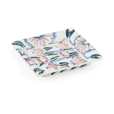 of square form, decorated with red, blue, yellow and green flowers, painted initials JMK with gate and rabbit marks