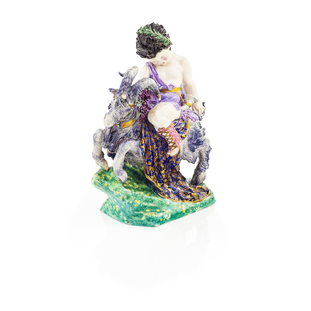 finely modelled in gilt and coloured enamels with a Bacchanalian scene and raised on a shaped rectangular base painted with autumn leaves, base bears inscription C.VYSE/ RBS/ 1920, chips