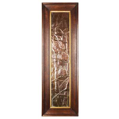 each repoussé decorated with owls perching on branches, enclosed within oak frames (2)