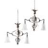 with hammered finish, each with three scrolling arms suspending frosted glass shades with leafy bracket supports and spiral tendril decoration (2)