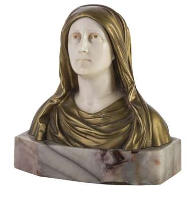 'MADONNA', CARVED IVORY AND PATINATED BRONZE BUST, CIRCA 1920