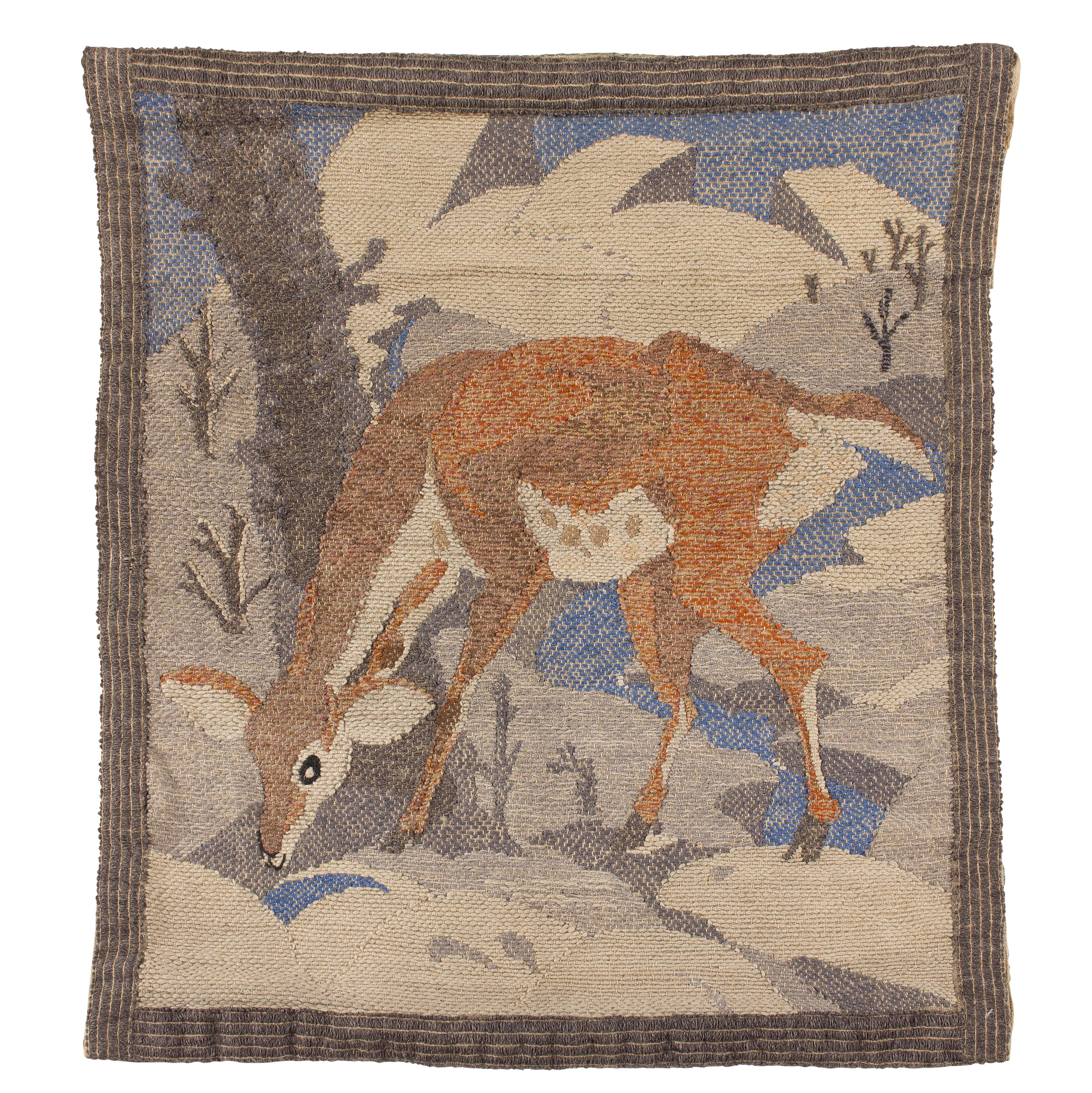 worked as a deer drinking from a stream in a stylised landscape, 70cm x 67cm; also a SARDINIAN WOOL EMBROIDERED PANEL, CIRCA 1925, lattice design in coloured threads, bears Morton Sundour Museum & Library printed label, Number 878/ Case 1/ Shelf 3, 86cm x 50cm (2)