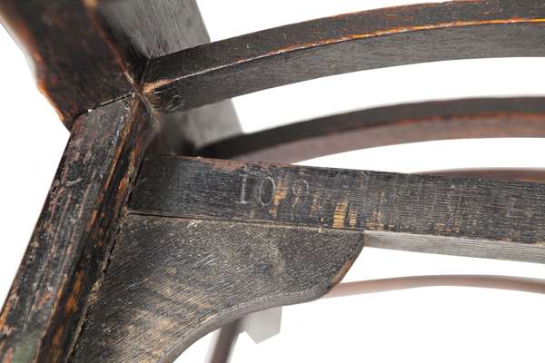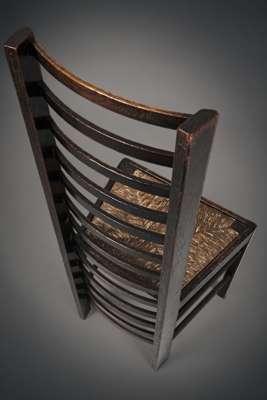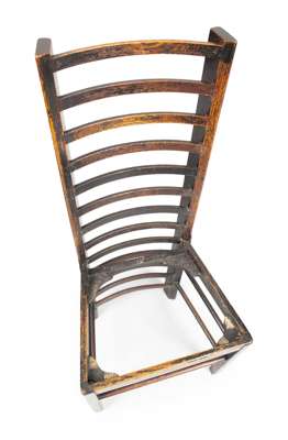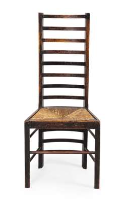 Note: Mackintosh had produced versions of the traditional ladderback chair before, first for David Gauld in 1893 and then as a bedroom chair at Windyhill in 1901. This understated and deceptively simple design of 1903, for Miss Cranston's new Willow Tearooms in Sauchiehall Street, is his most successful treatment of this vernacular form. The dark wood against by the pale walls and tablecloths of the tearoom interiors accentuating the striking lines of this one of Mackintosh's most recognisable chairs.