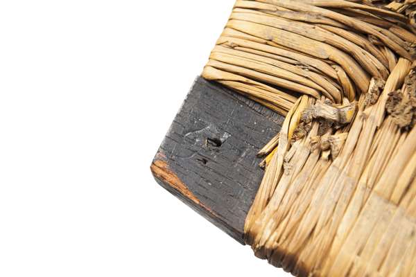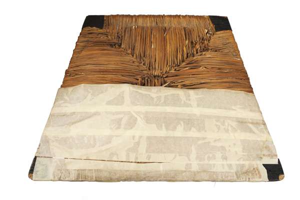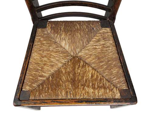 the high back with thirteen gently bowed rectangular horizontal splats above original rush covered drop-in seat, raised above square section legs, joined by five cylindrical stretchers