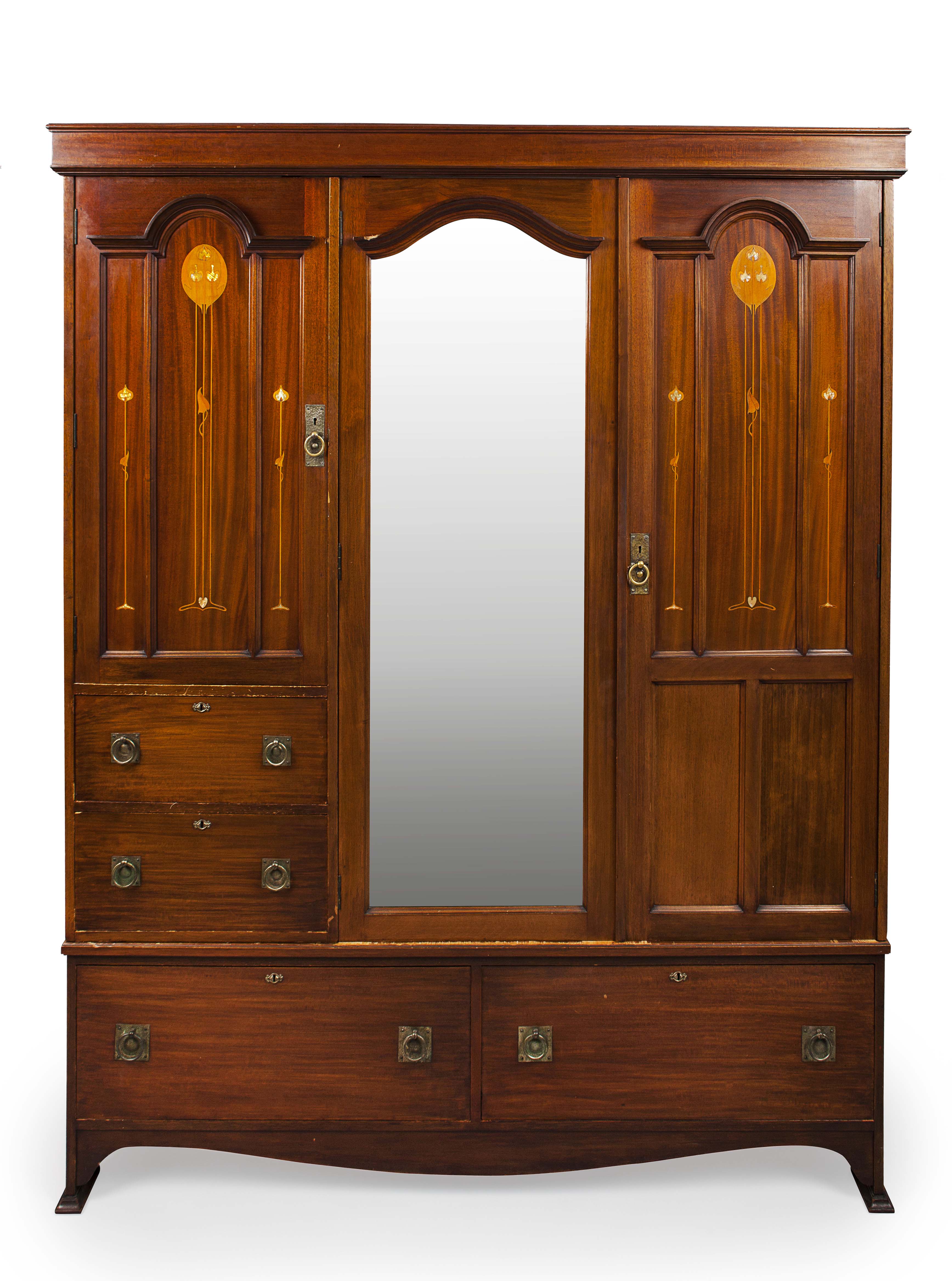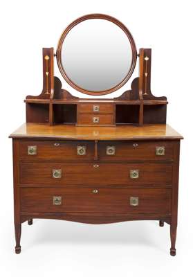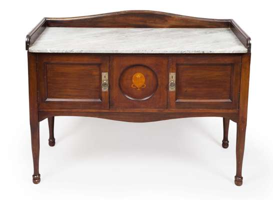 comprising a WARDROBE, with a central mirror door flanked by two doors and three drawers, the whole inlaid with stylised plant forms and raised on bracket feet, 173cm wide, 207cm high, 52cm deep; a DRESSING TABLE, with a circular swing mirror above two jewellery drawers, two short over two long drawers, and turned legs, 115cm wide, 168cm high, 52cm deep; and a matching MARBLE TOP WASHSTAND, 110cm wide, 88cm high, 51cm deep (3)