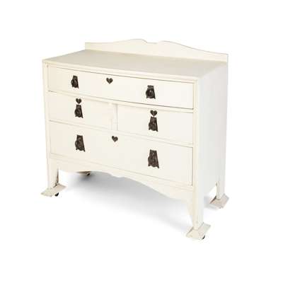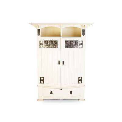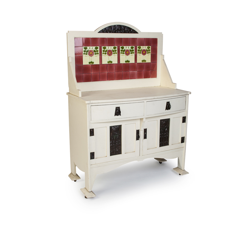 comprising a WARDROBE, the moulded cornice above arched open shelf and two doors, each inset with embossed copper panels of Glasgow Style roses, the base with single drawer, stamped mark R214/118, 151cm wide, 213.5cm high, 60cm deep; a WASHSTAND, with tiled splashback above two drawers over two cupboards, stamped mark R214/82, 102cm wide, 138cm high, 47cm deep; and a MATCHING SIDE CABINET/ CHEST, with single frieze drawer above two short and one long recessed drawer, stamped marks R214/82, 102.5cm wide, 92cm high, 52cm deep (3)
