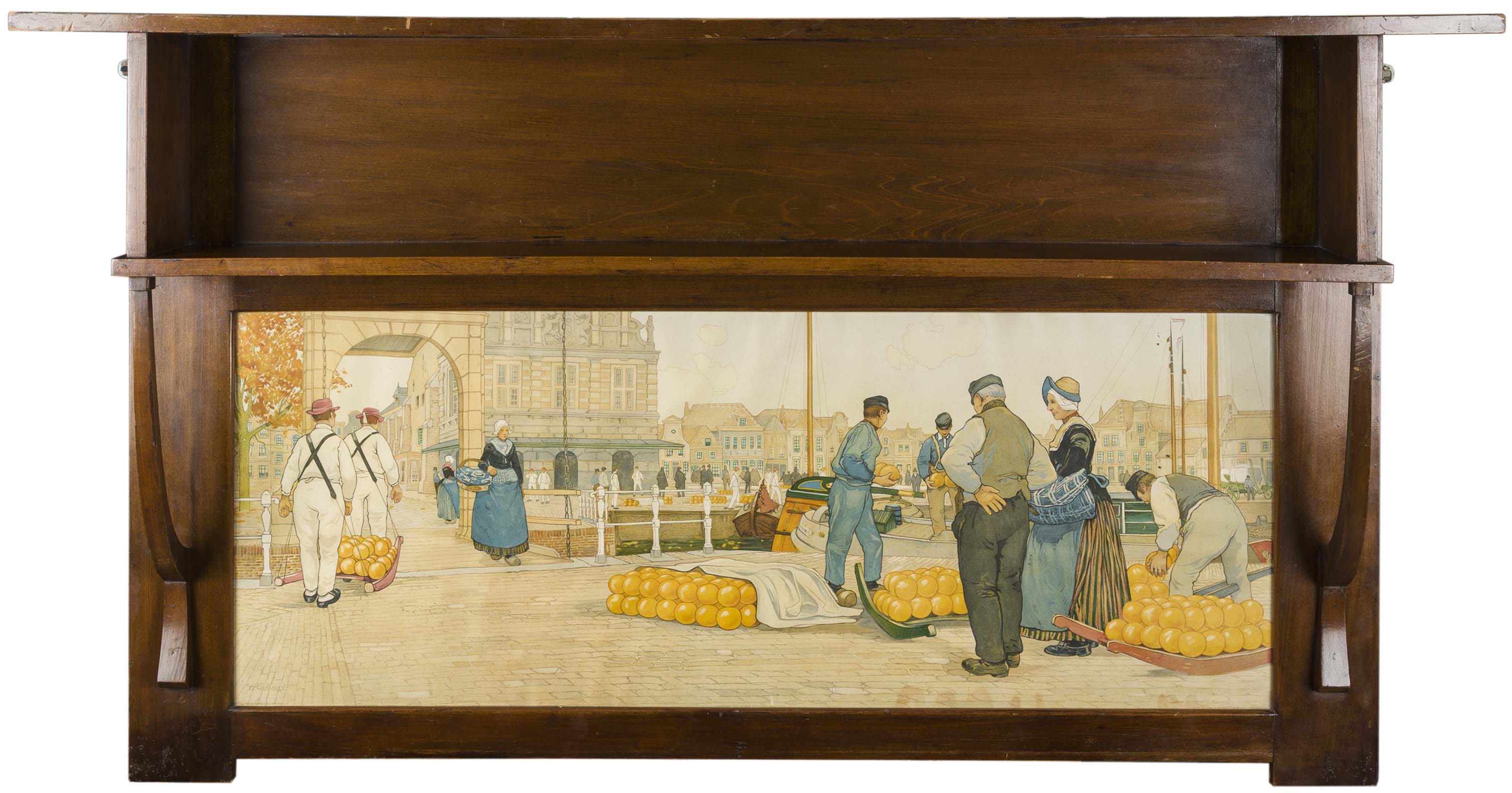 with two open shelves with bracket supports, and a framed print depicting a Dutch scene, bears ivorine maker's label