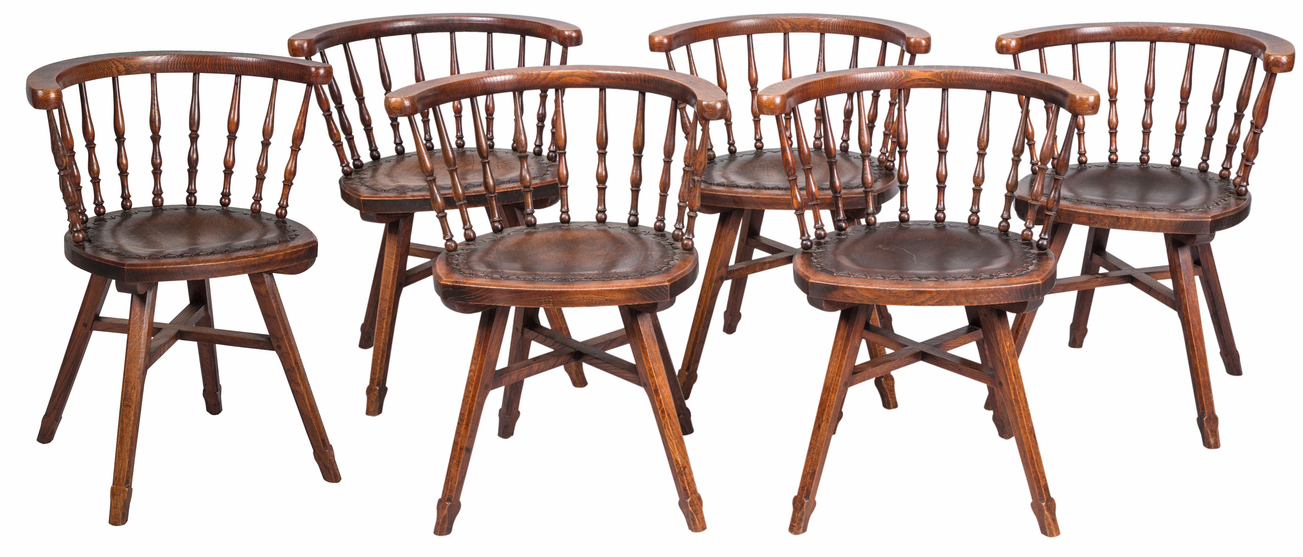 each with curved top rails and turned spindle-filled backs on leather panelled seats and tapered legs linked by stretchers (6)