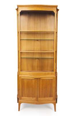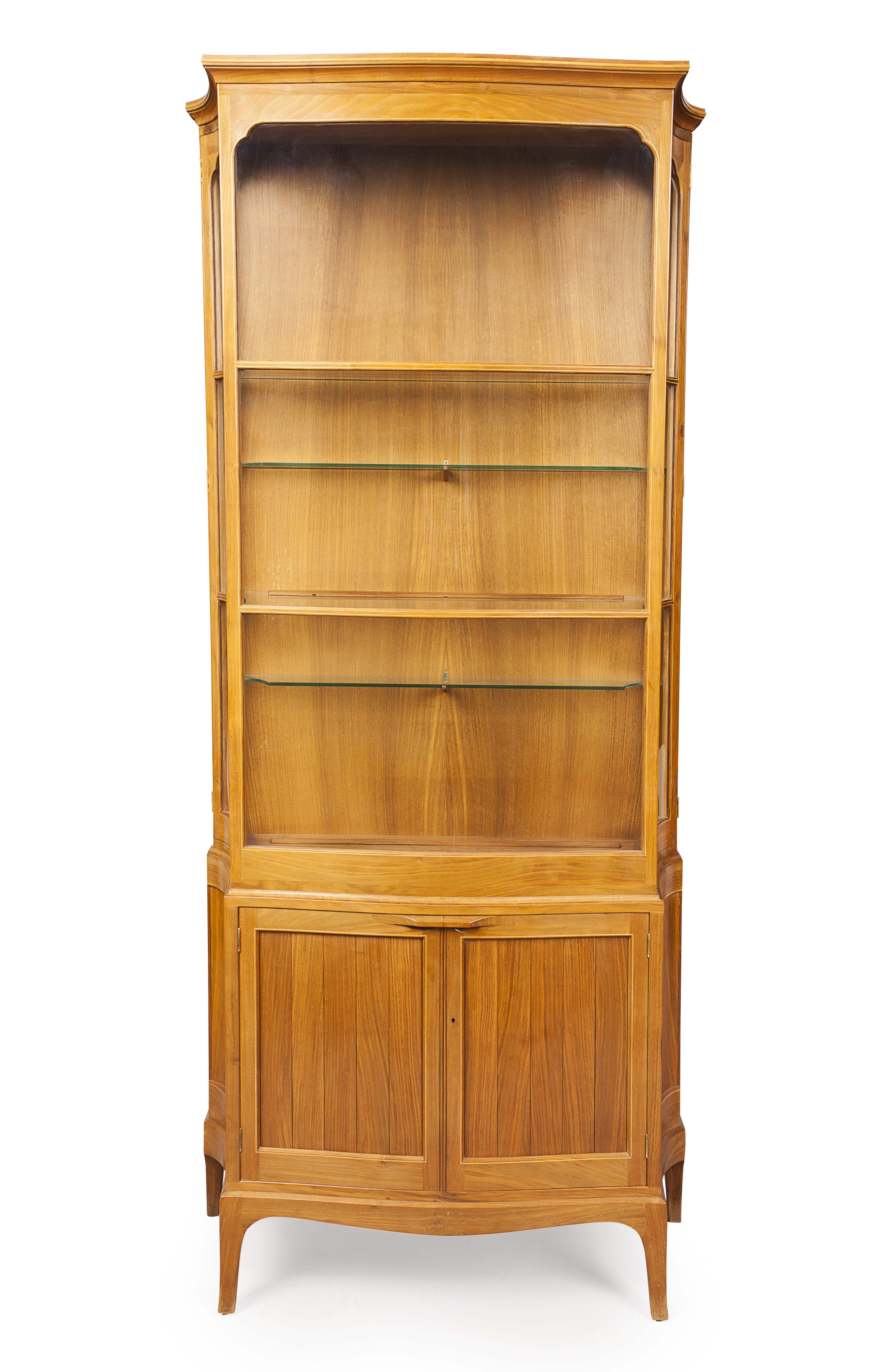 of serpentine form with boxwood stringing, the central glazed panel enclosed by two side doors and with shelved interior, the whole above two panelled doors on slender bracket feet