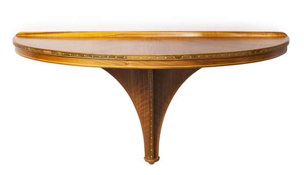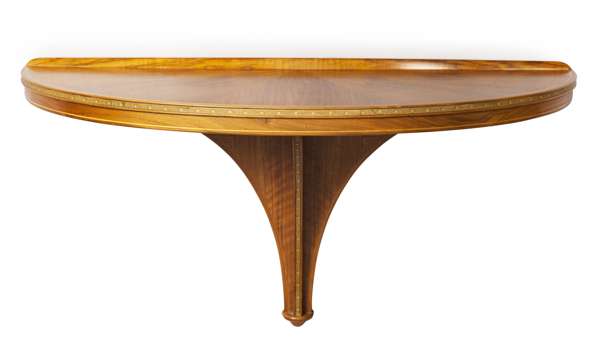 PAIR OF WALL MOUNTED WALNUT DEMI-LUNE CONSOLE TABLES, LATE 20TH CENTURY
