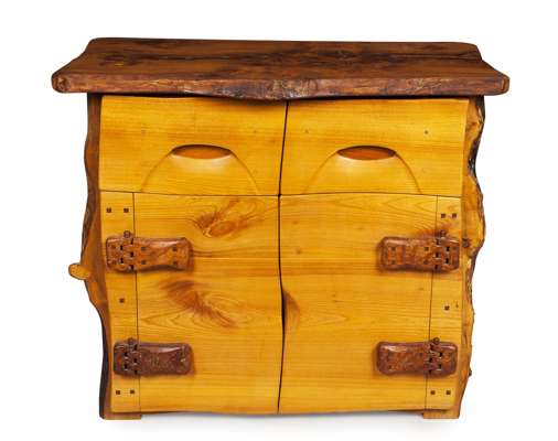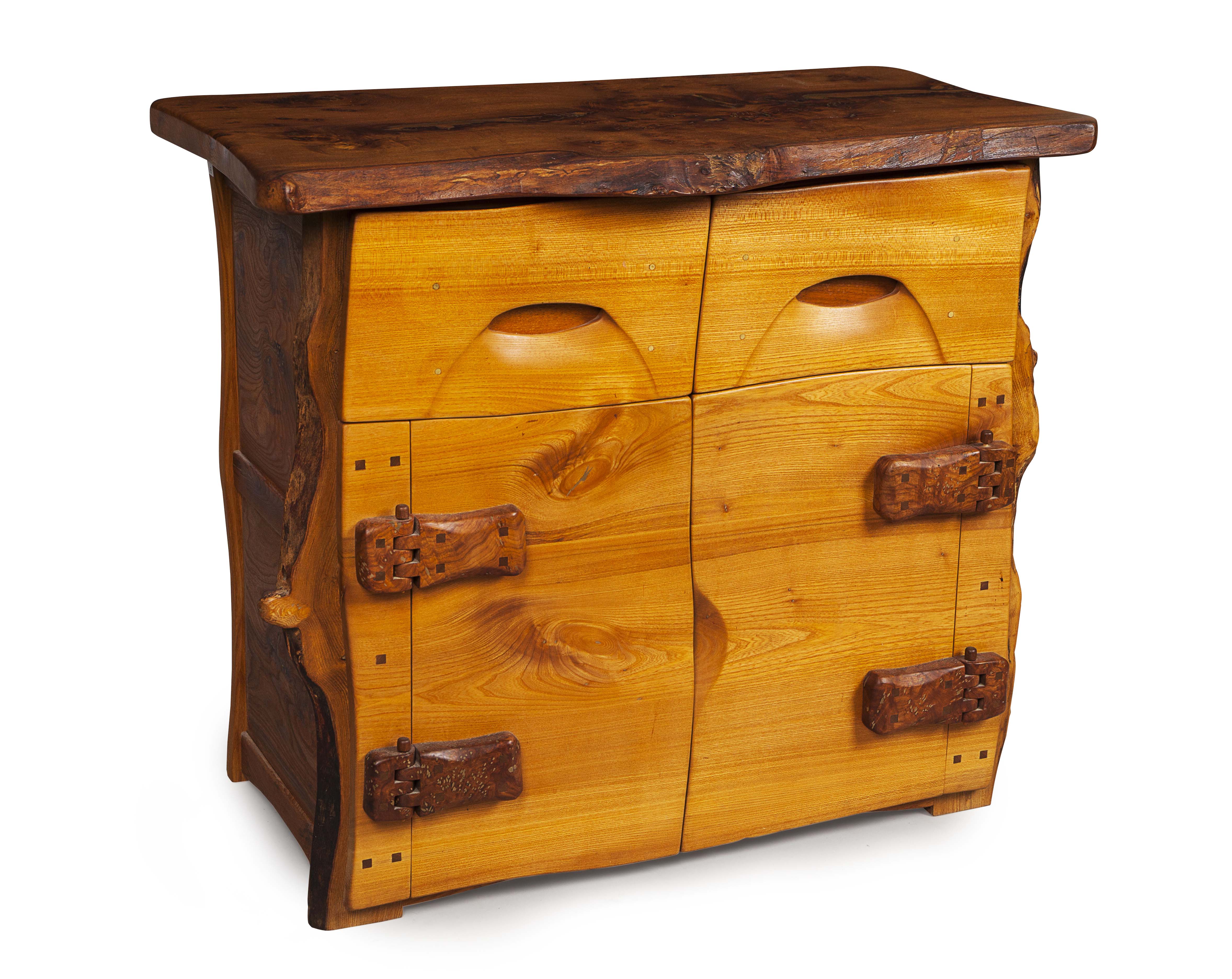 enhanced with gold wood filler, the freeform top above two drawers with two cupboards below enclosing a fixed shelf