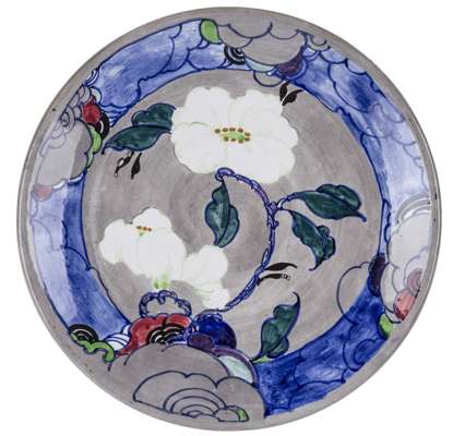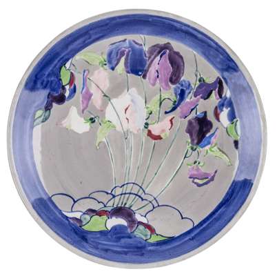 one decorated by Elizabeth Amour, with Camellias, 31cm diameter; the other decorated by Richard Amour, with Sweetpeas, 31cm diameter, both with printed and painted maker's marks (2)