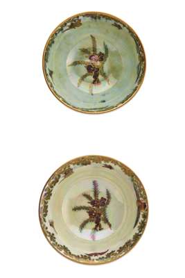 a York cup, 10cm diameter; and a Marston bowl, 9.8cm diameter, each decorated with 'Leapfrogging Elves' pattern, decorated inside and out with fairies on a multi-coloured ground, printed maker's marks Z4968D (hairline to Marston bowl) (2)