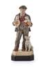 modelled as a man in a striped suit, his dog by his side and holding two puppies in his hands, wooden plinth base, incised mark to side C. VYSE/ CHELSEA