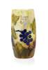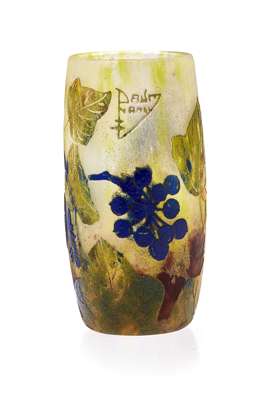 the swollen cylindrical amethyst and pale yellow glass body, acid etched and painted in coloured enamels with a design of fruiting ivy, cameo mark DAUM/ NANCY, with Cross of Lorraine