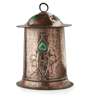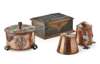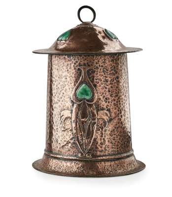 of circular form, the cover set with three Ruskin roundels, the whole repoussé decorated with stylised dragon panels, hoop feet, 16cm diameter, 12cm high; together with a JEWELLERY BOX, with a repoussé decorated metal lid set with cabochons, 23cm wide; a COPPER AND RUSKIN SET INKWELL, 9cm high; a COPPER AND RUSKIN SET CYLIDRICAL BOX AND COVER, 13cm high; and a COPPER AND RUSKIN SET COAL BIN AND COVER (some damages), 52.5cm high (including handle) (5)