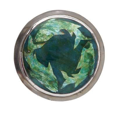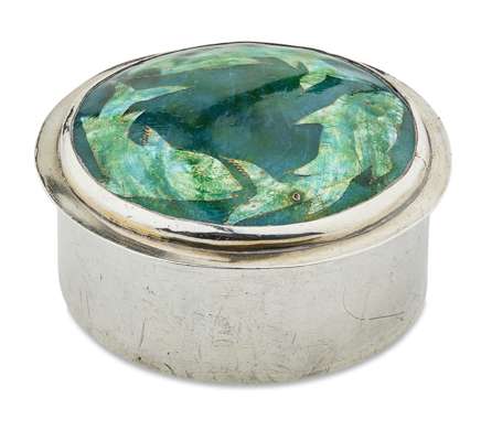 decorated to the cover with an enamelled panel, of swimming fish, hallmarked Sheffield 1910, maker's mark W.T.