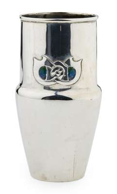 of cylindrical tapering form, with enamelled Celtic panel, hallmarked Birmingham 1907, maker's marks CYMRIC/ L&Co