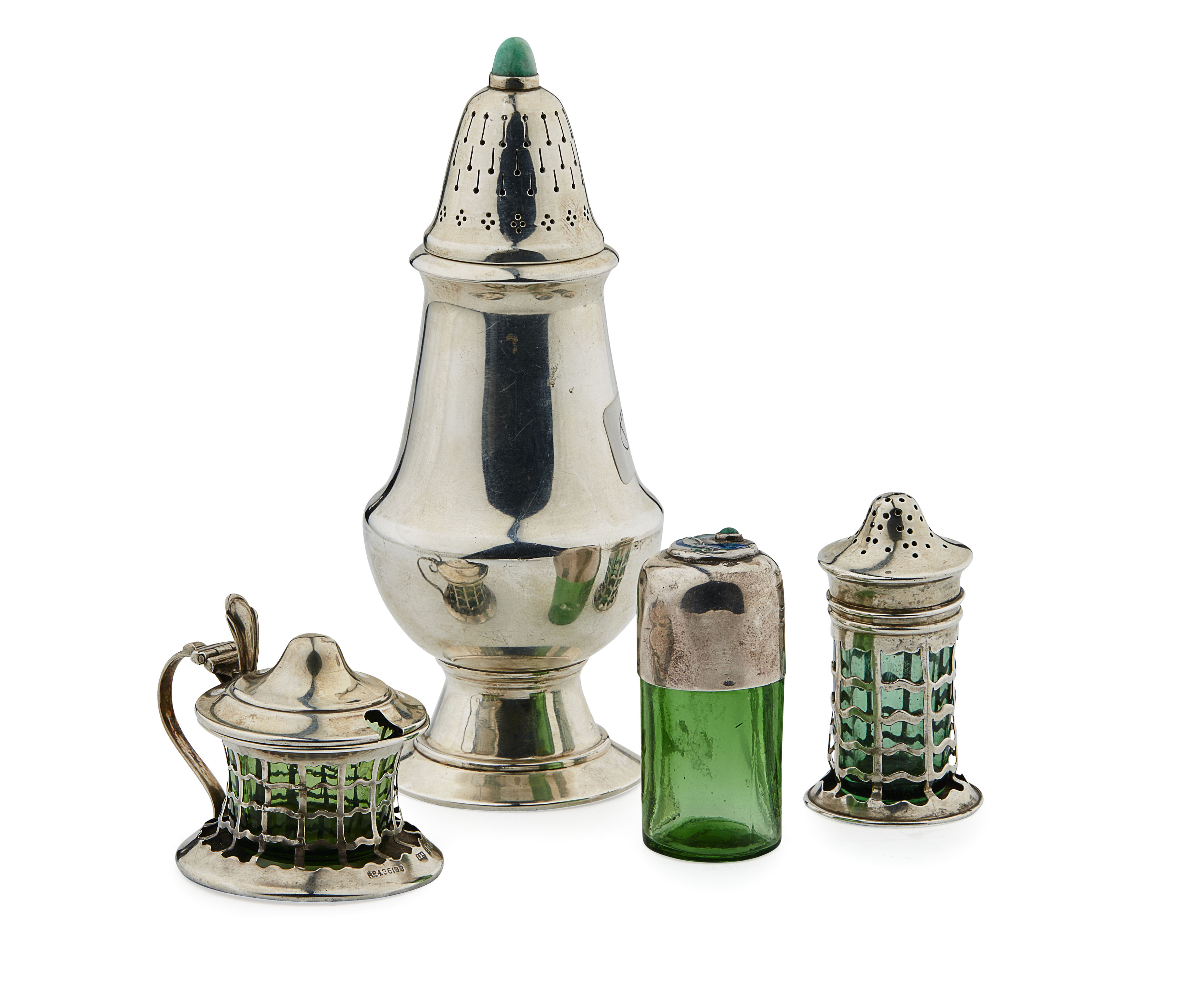 of tapering footed form, embellished with inset turquoise cabochon, hallmarked Birmingham 1904, 15cm high; together with a LIBERTY & CO., LONDON, SILVER AND ENAMEL MOUNTED GLASS BOTTLE, designed by Archibald Knox, the cylindrical green glass bottle with silver cover, set with Celtic enamelled roundel, hallmarked Birmingham 1904, 6cm high, both with maker's marks CYMRIC/ L&Co; and TWO LEVI & SALAMAN SILVER MOUNTED CRUETS, hallmarked Birmingham 1912, 6.3cm and 4.8cm high (4)