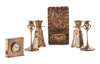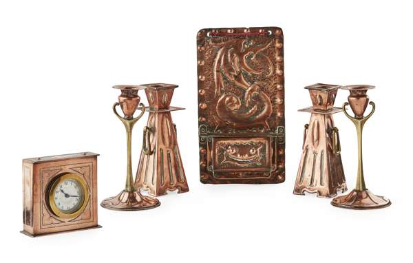 repoussé decorated with stylised plant forms, 14cm wide, 25cm high; together with a PAIR OF COPPER AND BRASS CANDLESTICKS, in the manner of Benson, 19cm high; a PAIR OF ARTS & CRAFTS COPPER CANDLESTICKS, CIRCA 1900, of pierced tapering form, with brass side handles, 17cm high; an ARTS & CRAFTS REPOUSSE COPPER PHOTOGRAPH FRAME, 20cm square; and SMALL ARTS & CRAFTS COPPER MANTEL TIMEPIECE, CIRCA 1910, with chased decoration and initials to the top edge, 11cm high (7)