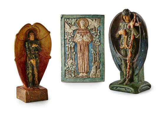 impressed mark (broken and repaired), 22cm high; and ANOTHER COMPTON POTTERY FIGURE, impressed mark, 20cm high; and a WALL PLAQUE, CIRCA 1900, depicting St Francis, impressed mark ,18cm x 12cm (3)